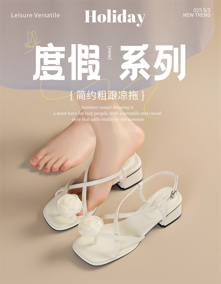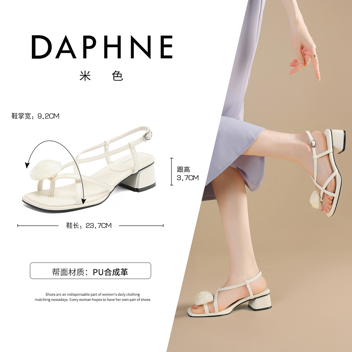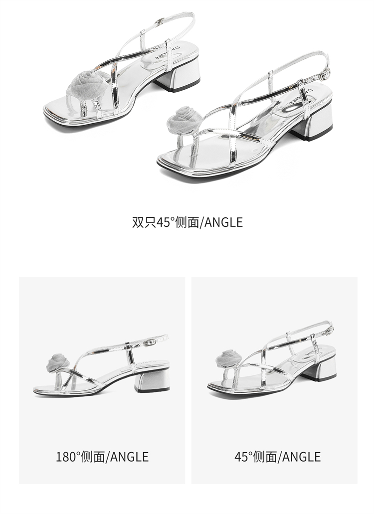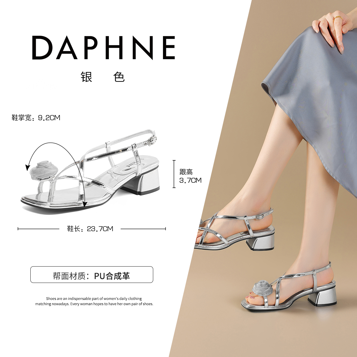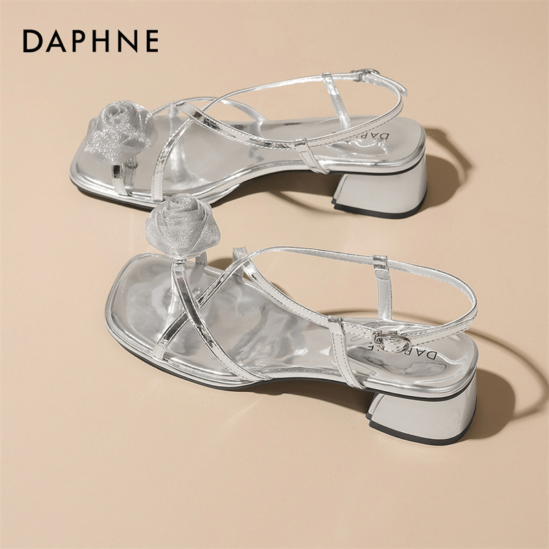 代发达芙妮银色夹趾一字带凉鞋女2025夏季新款法式方头百搭粗跟罗马鞋