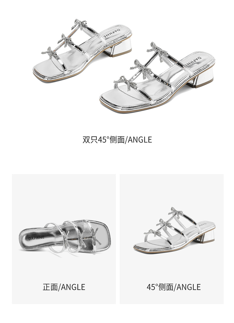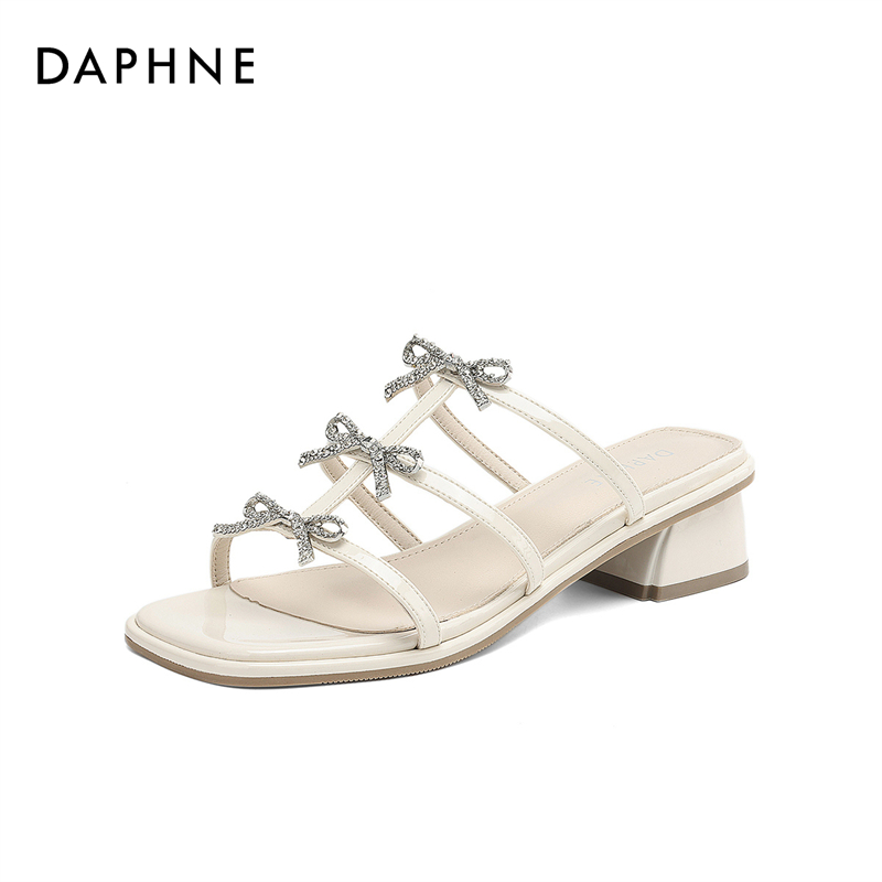 代发达芙妮2025新款时装拖鞋女法式方头水钻蝴蝶结粗跟百搭舒适女鞋夏