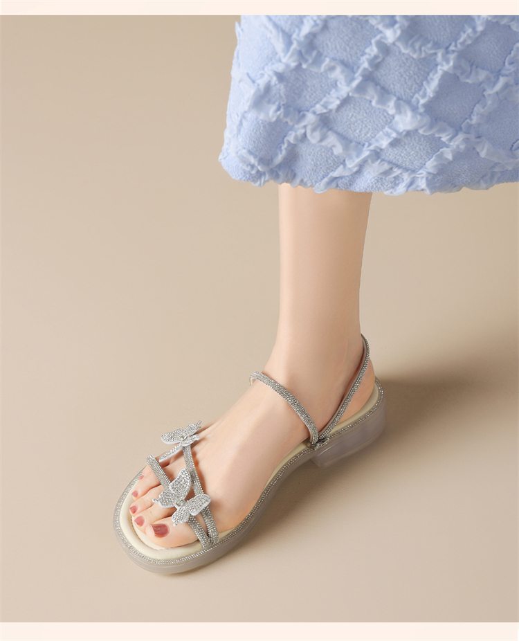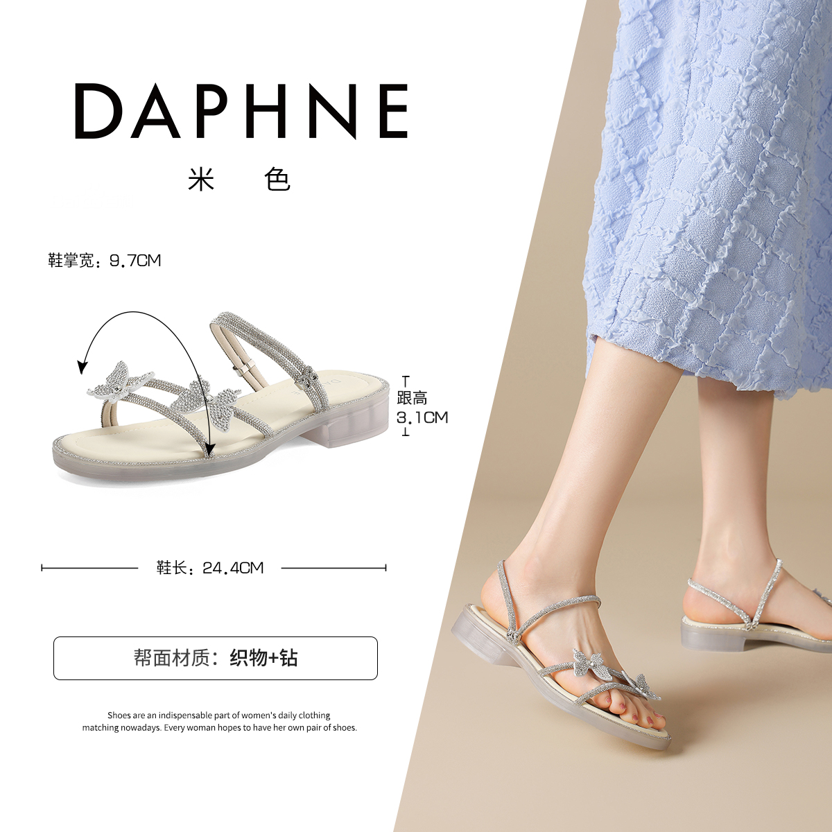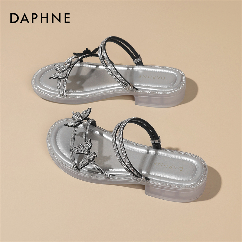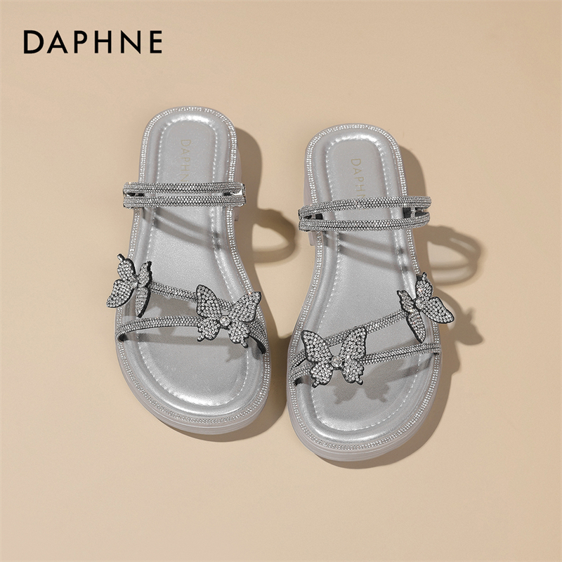 代发达芙妮银色平底两穿凉鞋女2025夏季外穿配裙子时尚水钻蝴蝶凉拖鞋