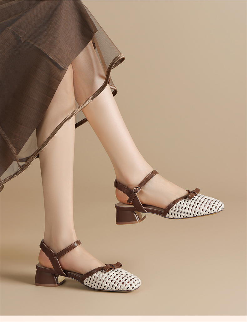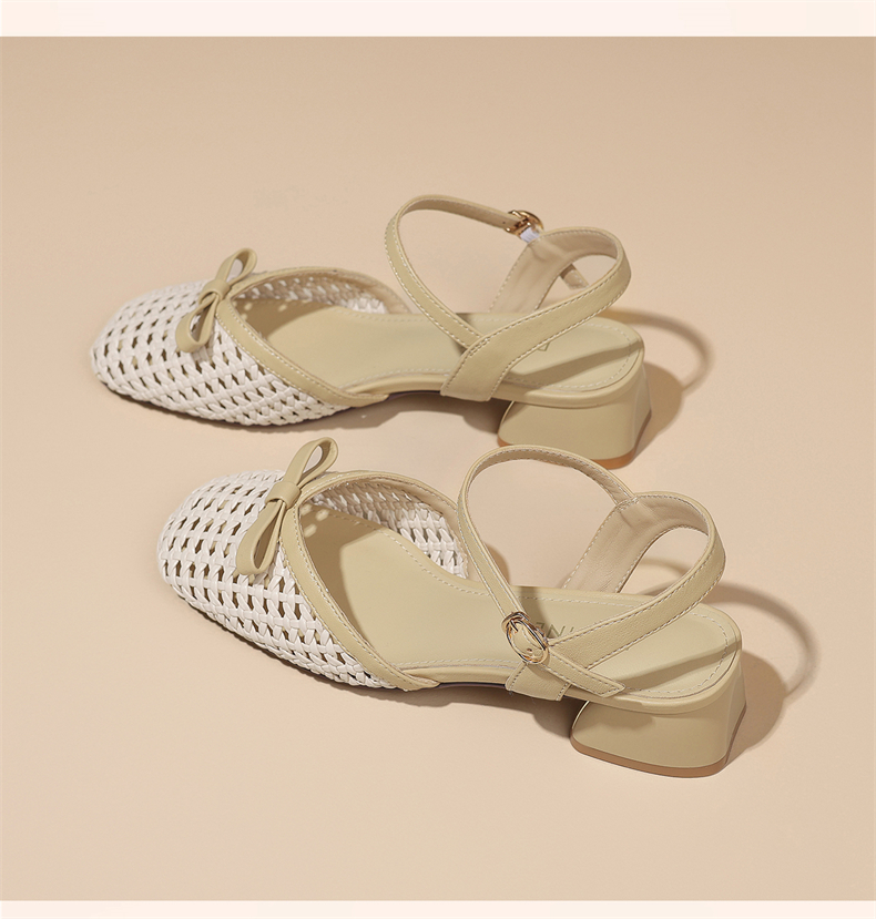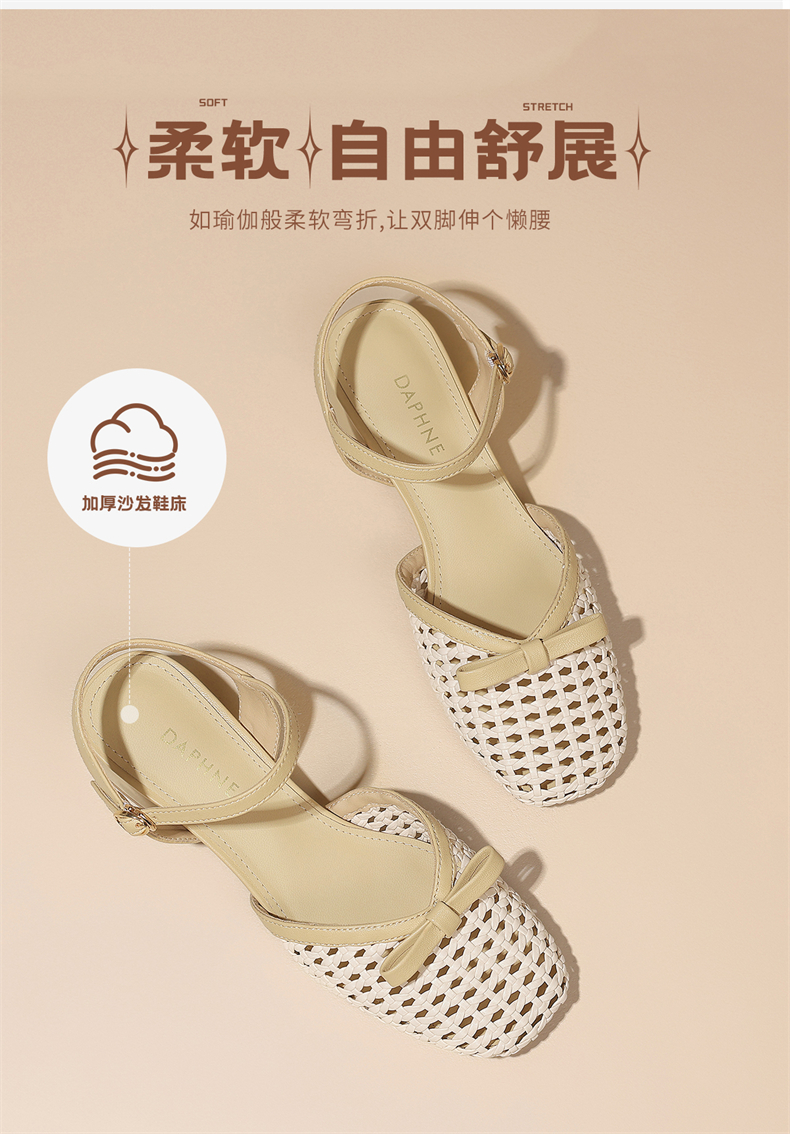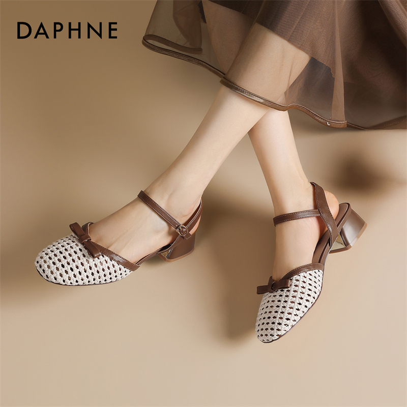 代发达芙妮蝴蝶结包头凉鞋女2025夏季新款外穿粗跟编织镂空玛丽珍女鞋