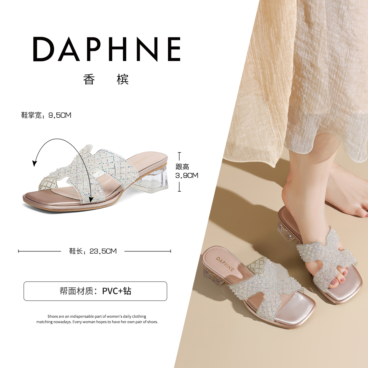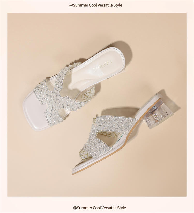 代发达芙妮法式水晶粗跟拖鞋女2025夏水钻外穿透明仙女风中跟一字凉拖