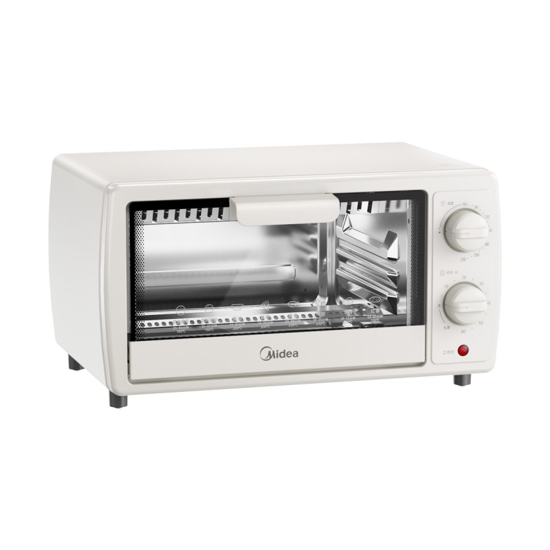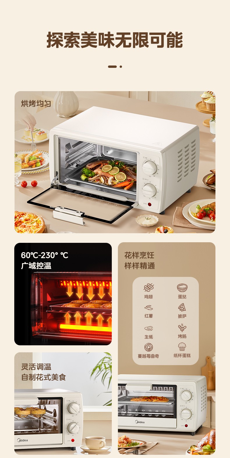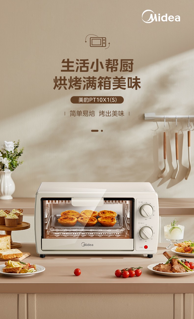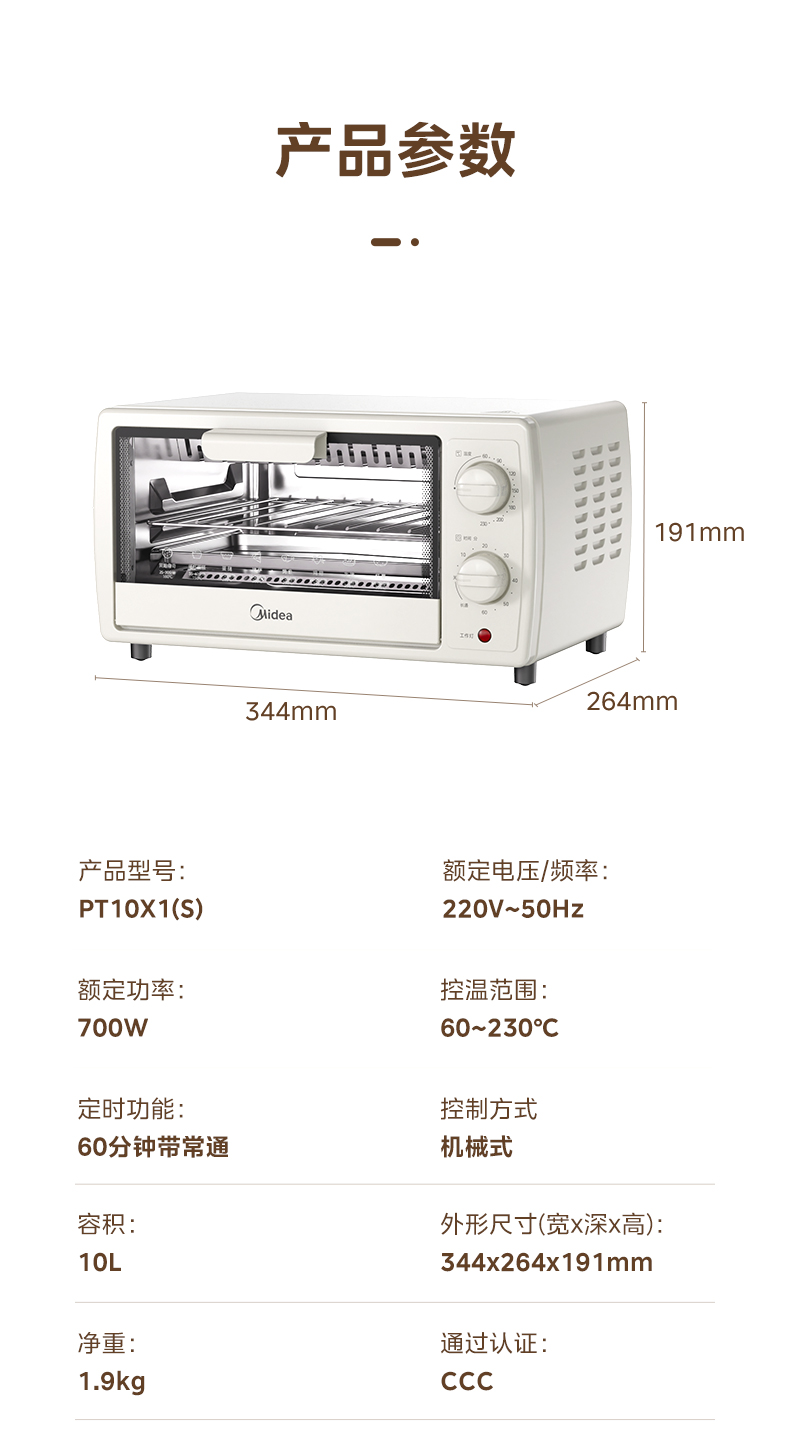 代发美的电烤箱旋钮控制容量10L-12L极简操作60-230℃宽幅调温上下加热金属烤管 PT10X1(S) (浅杏) 10L