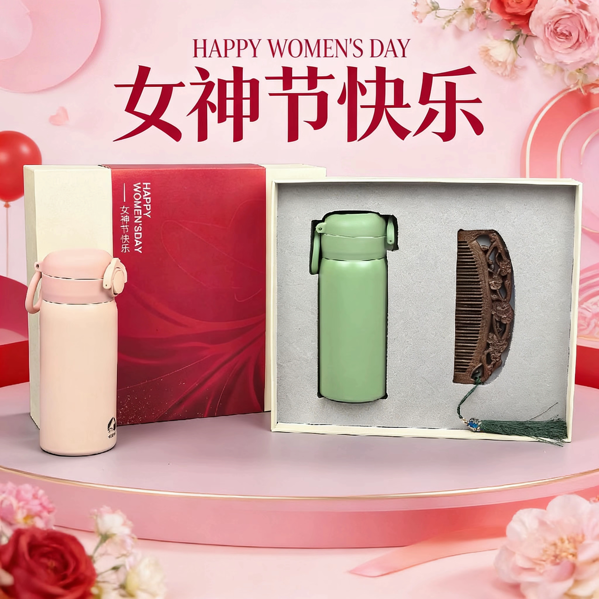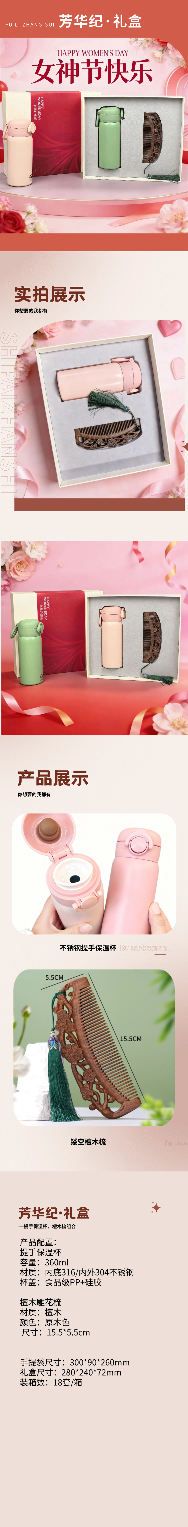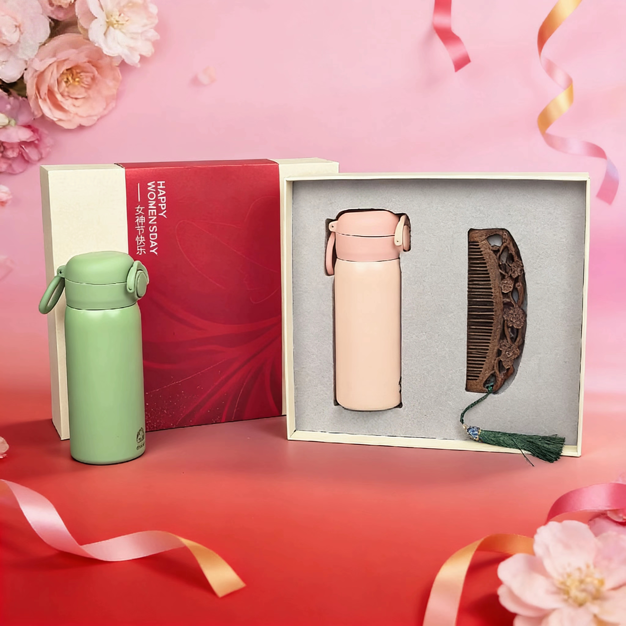 源头福礼掌柜三八女神节芳华纪提手保温杯檀木雕花梳礼盒组合