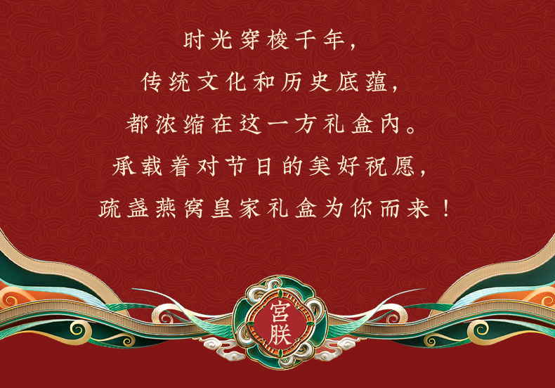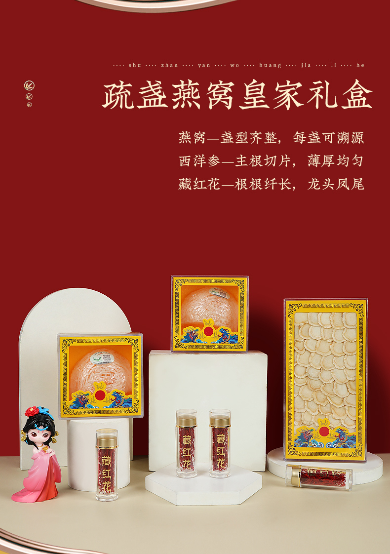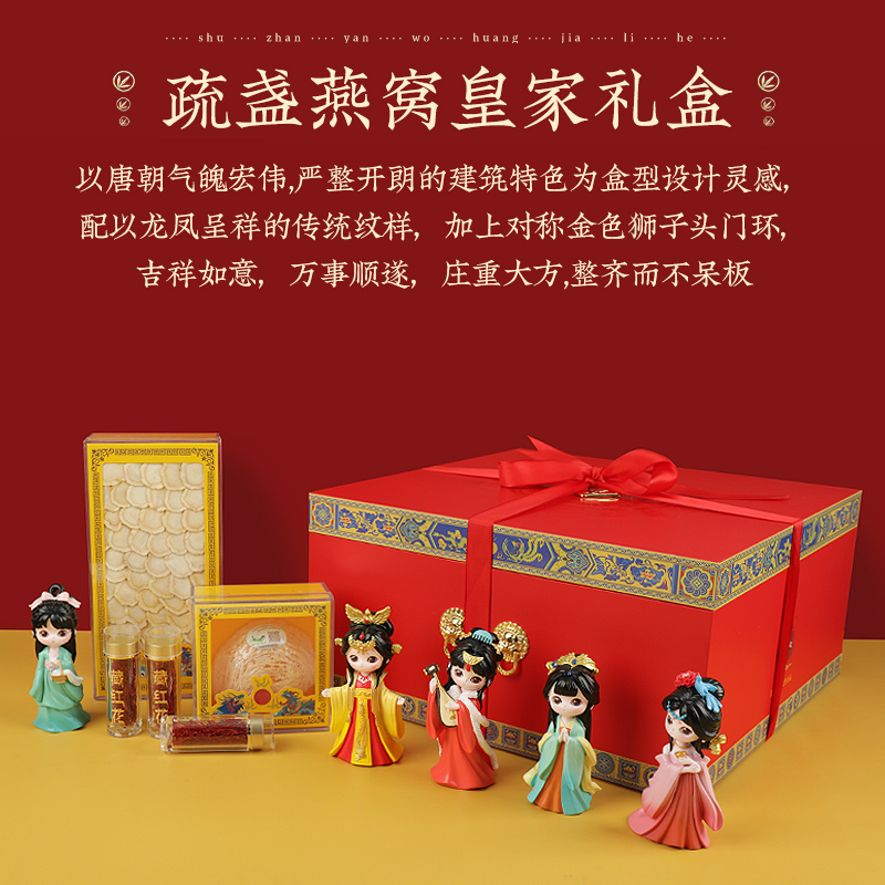 实物配置:疏盏燕窝 5 克4 盏、西洋参片 100 克1、藏红花 1 克 * 7,礼盒内含宫廷娘娘文创手伴,增添文化收藏价值,让礼品更具特色。
