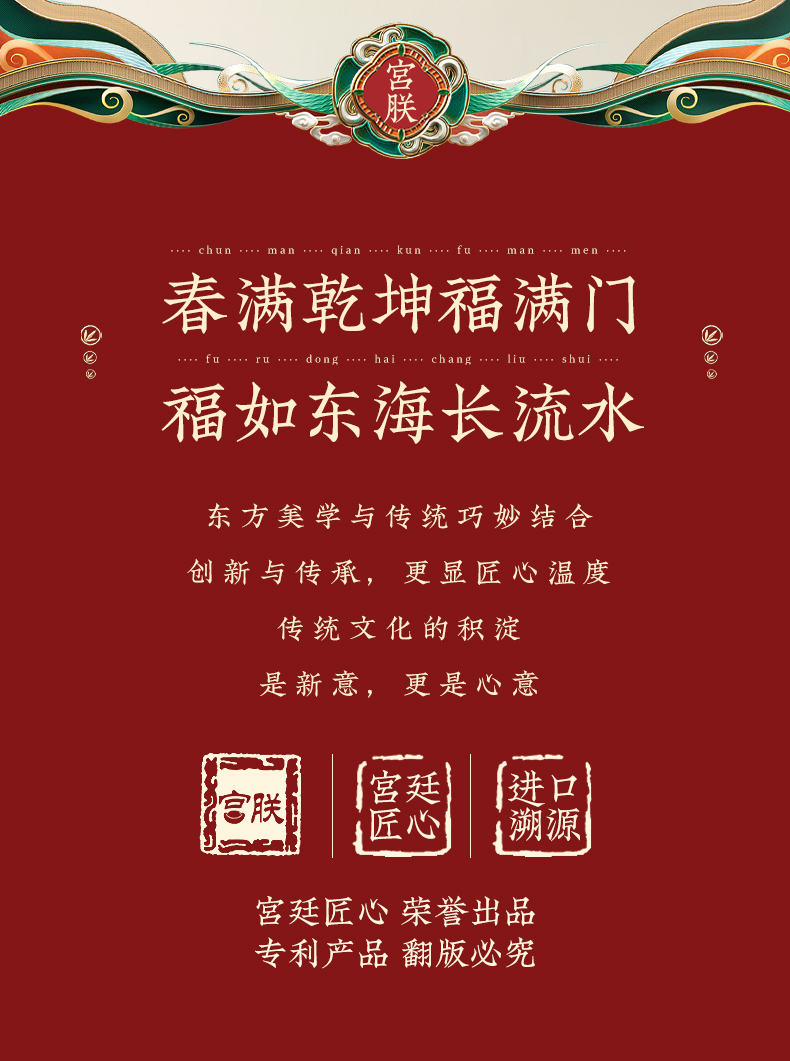 包装采用喜庆的中国红,融合传统美学和宫廷元素,传递活力与热情。盒面金属 “宫朕” 标志醒目,象征尊贵与吉祥,彰显产品独特身份;宫廷元素盒型设计,尽显大气质感。