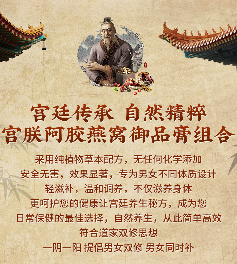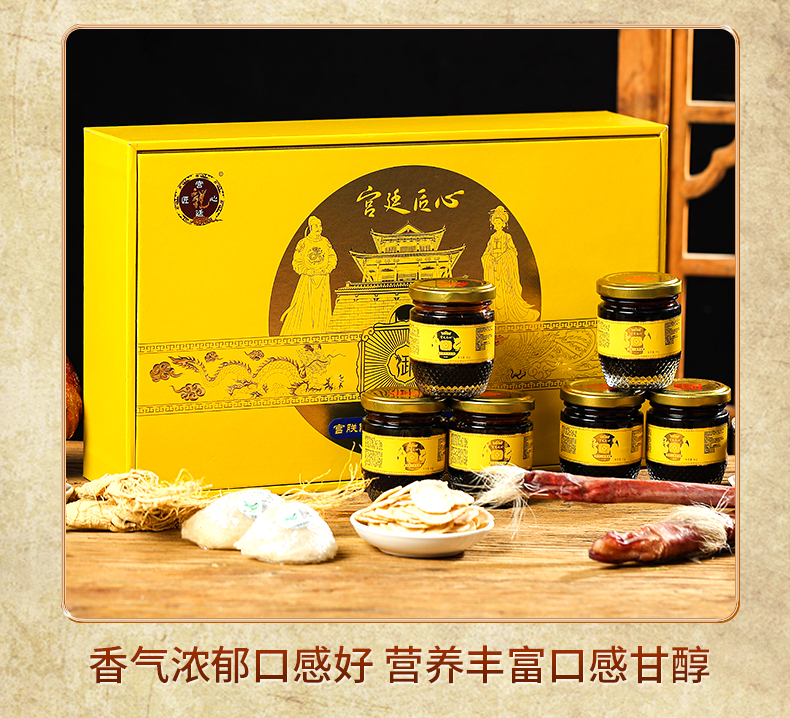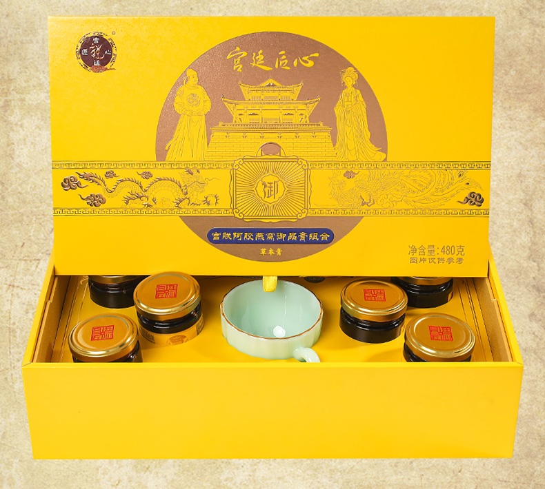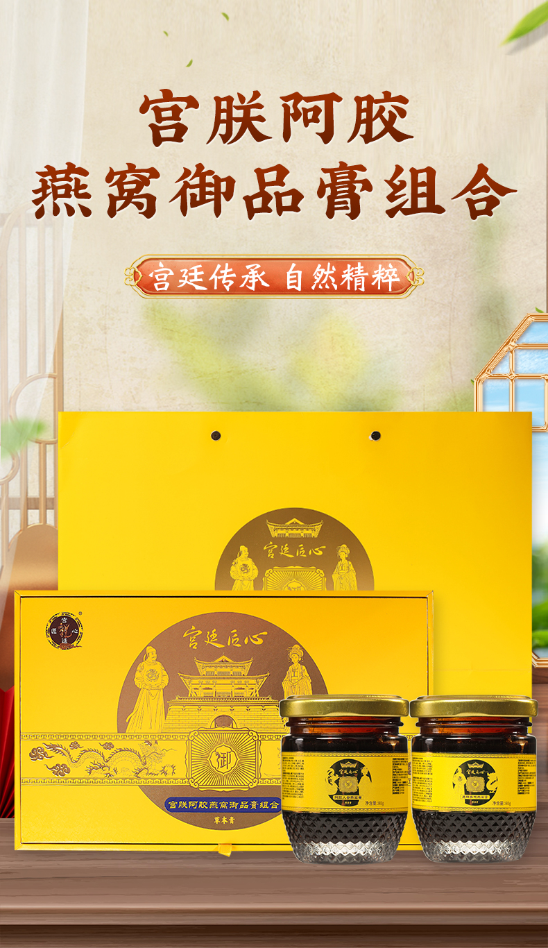 宫廷匠心男女组合新品宫联阿胶燕窝御品膏,传统工艺熬制,甄选优质原料,搭配茶具套装,礼盒包装,日常滋养与送礼皆宜。