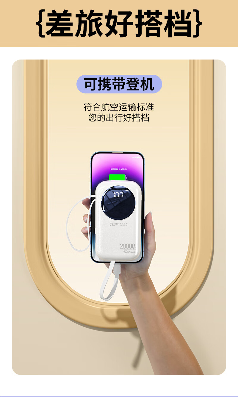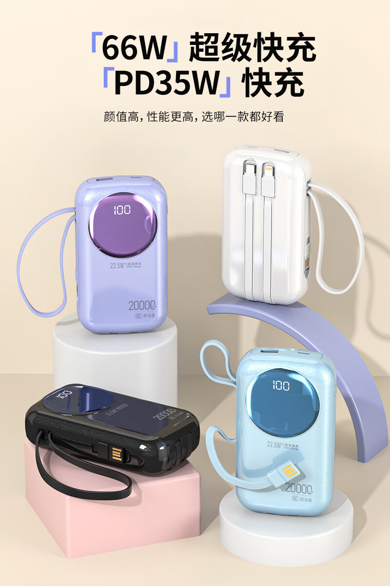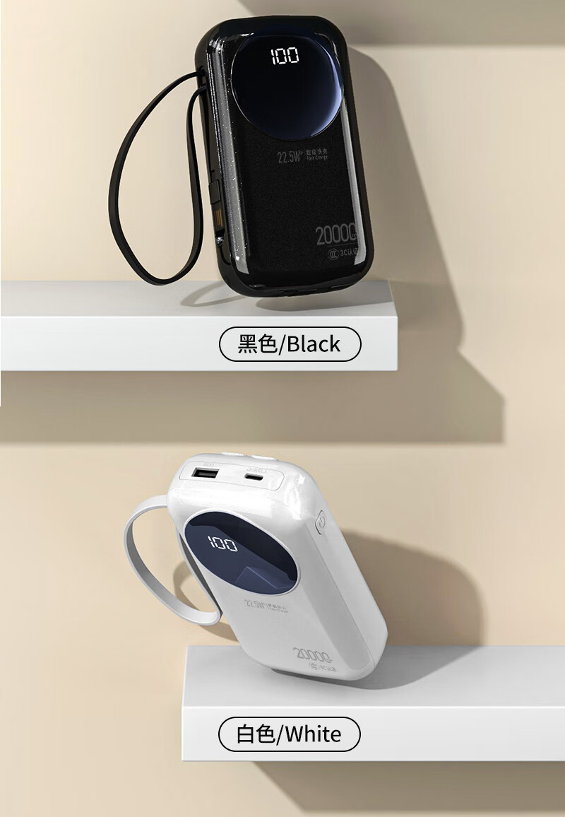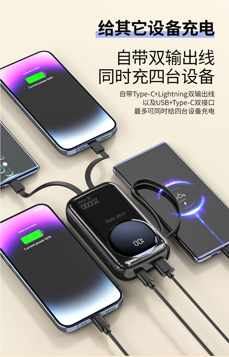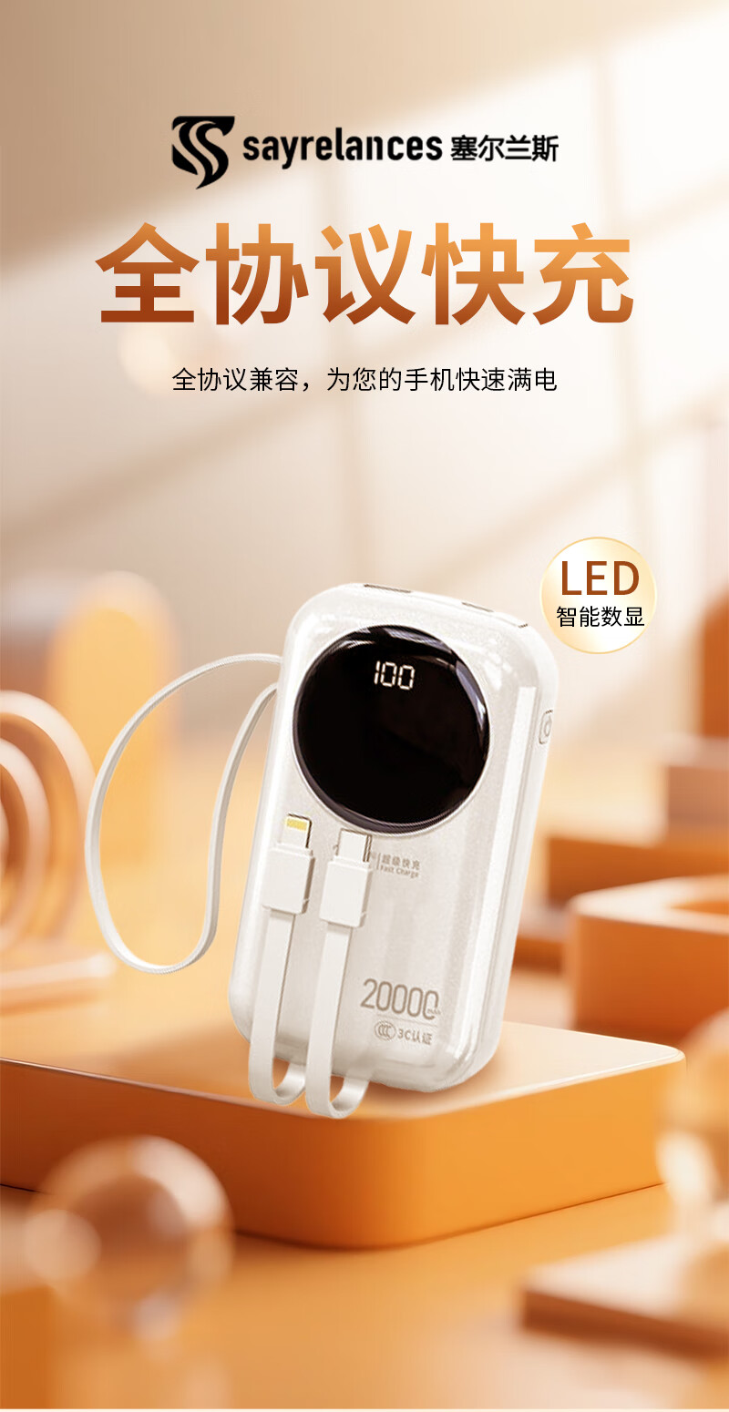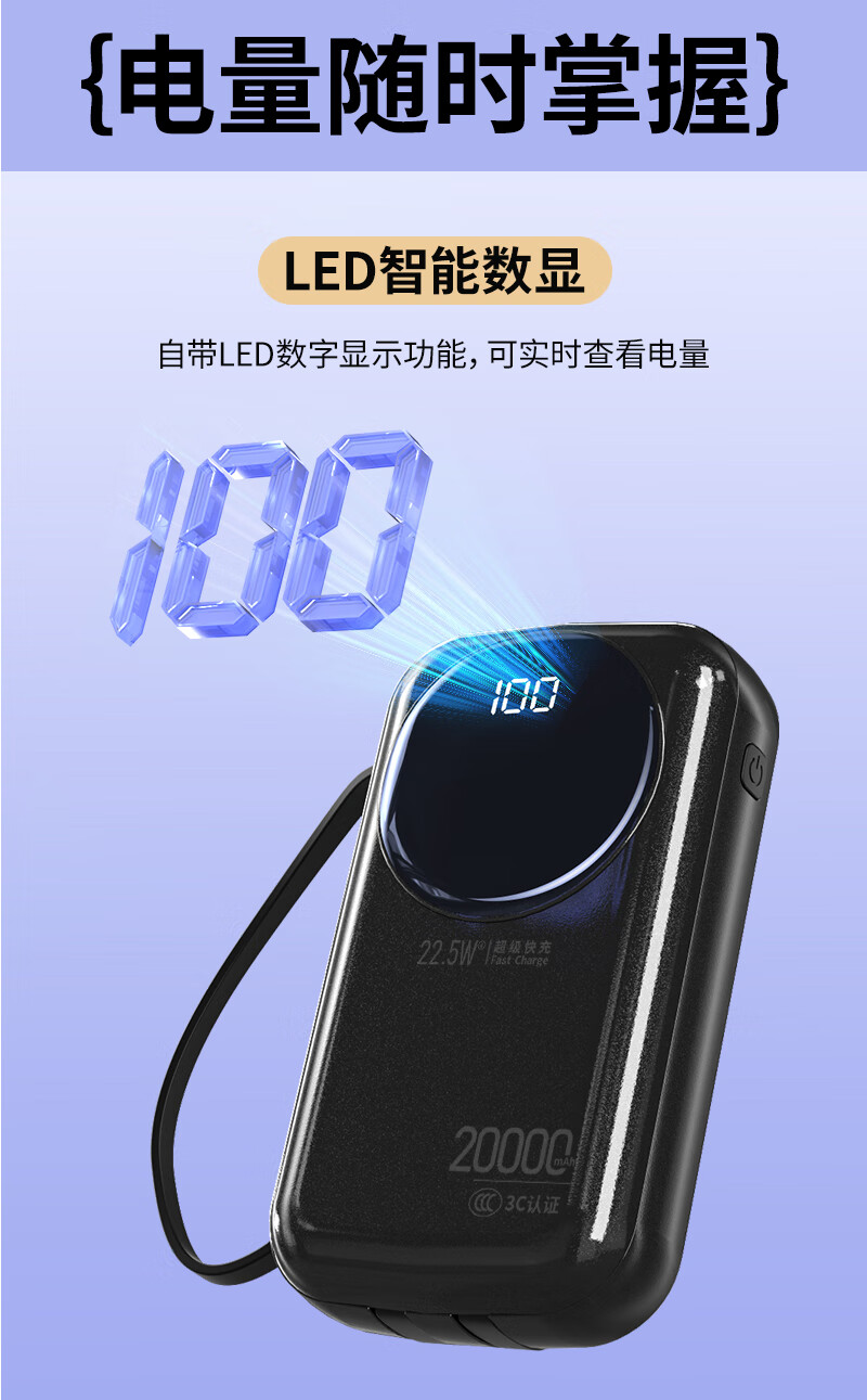 代发塞尔兰斯20000毫安大容量自带线66W超级快充适用苹果手机华为手机R37C电源 黑色
