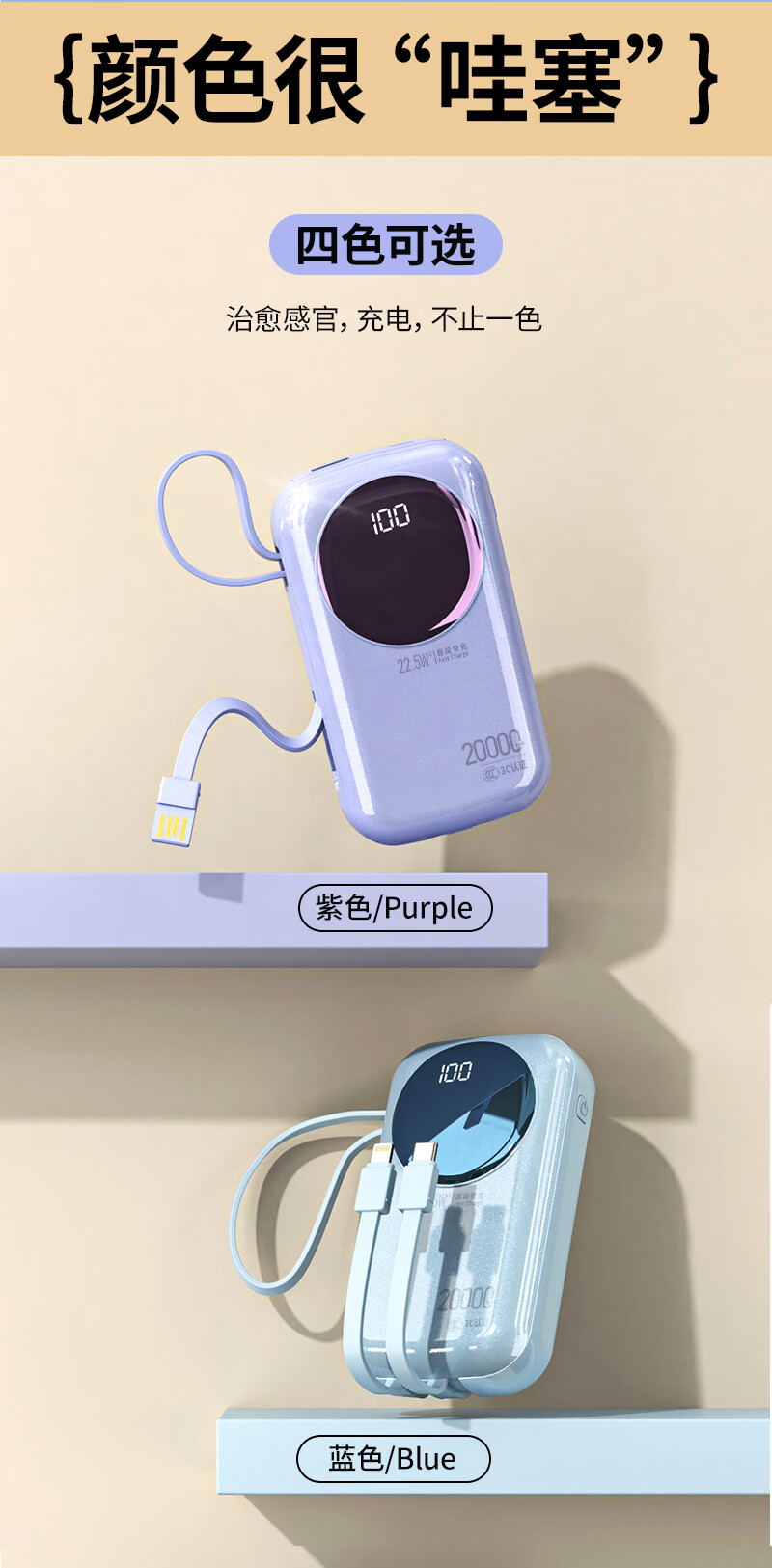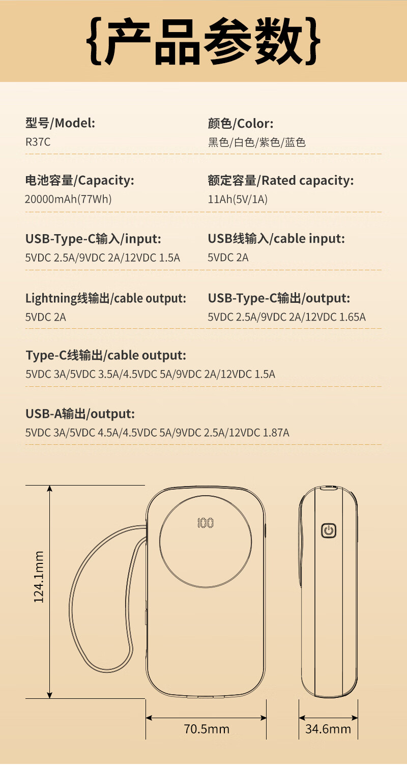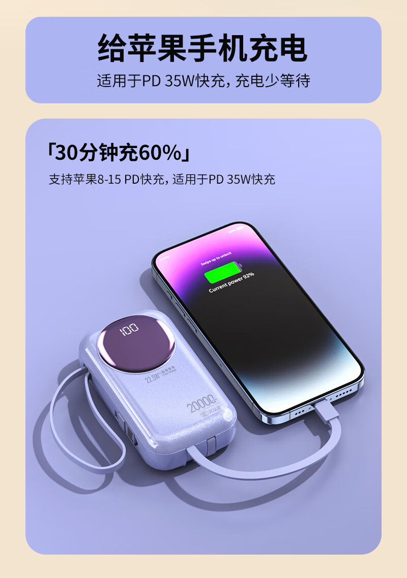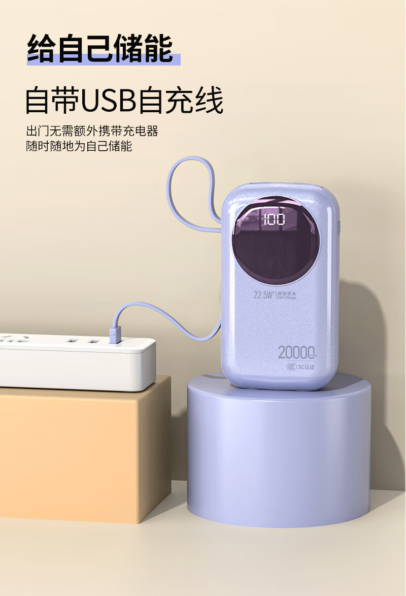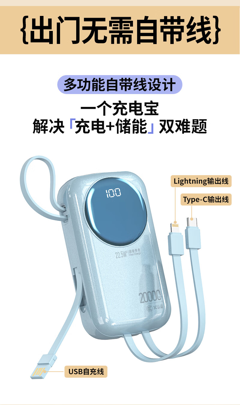 代发塞尔兰斯20000毫安大容量自带线66W超级快充适用苹果手机华为手机R37C电源 黑色